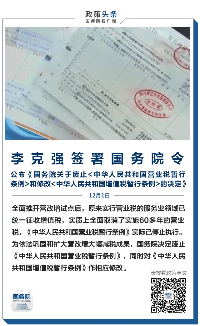 国务院总理李克强日前签署国务院令,公布《国务院关于废止〈中华人民共和国营业税暂行条例〉和修改〈中华人民共和国增值税暂行条例〉的决定》(以下简称《决定》),自公布之日起施行。